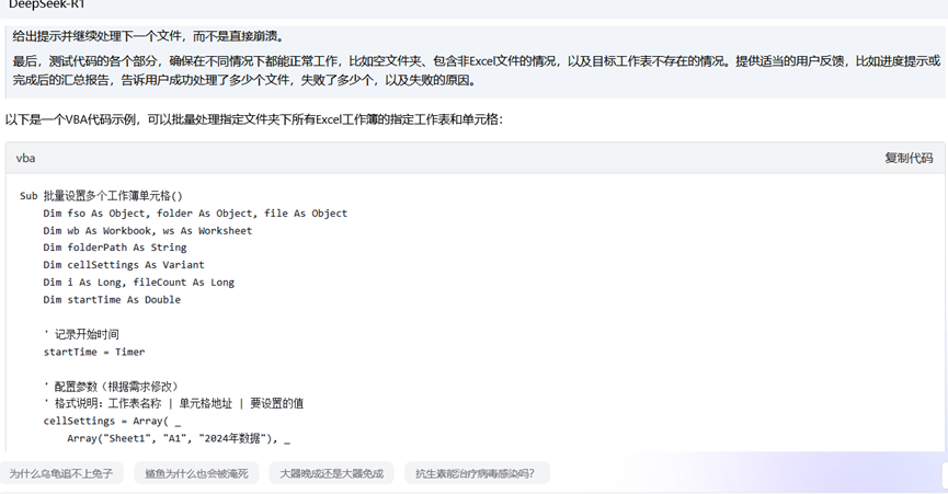 DeepSeek可以根据需求,自己进行写代码,最简单的就是VBA批量处理Excel只要具备一点代码知识,基本上都可以使用AI进行书写和修改,我们要做的就是监督、和调整。如下:批量改底稿编制人和编制日期抬头。
